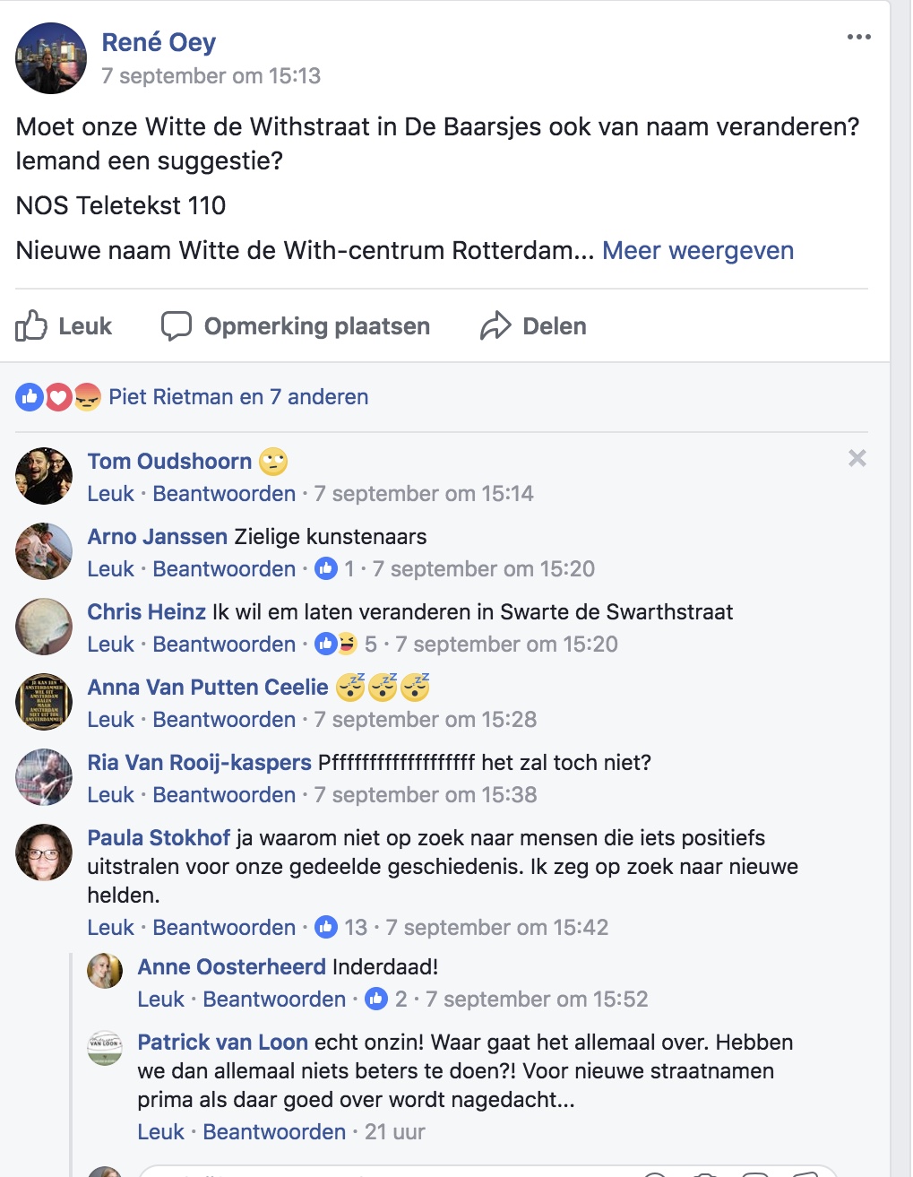 In Rotterdam is dit echt een issue geworden. Rijst de vraag: hoe moet dat dan met onze Witte de Withstraat in De Baarsjes? In de Facebookgroep De Baarsjes woedt al een paar dagen een discussie over de verandering van de naam van de straat.